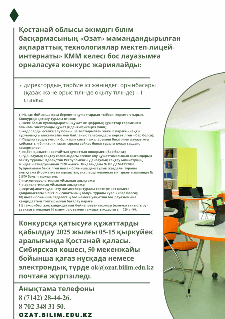 Бос жұмыс орындары 12.08.2024 Бос жұмыс орындары 11.08.2025 Бос жұмыс орындары 19.08.2024 Бос жұмыс орындары 21.08.2024 2024 жылғы 2 қыркүйектегі Комиссия отырысының қорытындысы Конкурстық комиссия отырысының 17.09.2024 ж. шешімі Веб-сайтта құжаттарды тапсырып, барлық бос жұмыс орындарын көре аласыз Ұлттық білім беру деректер қоры ЖЕКЕ ІС ПАРАҒЫ Жүктеу