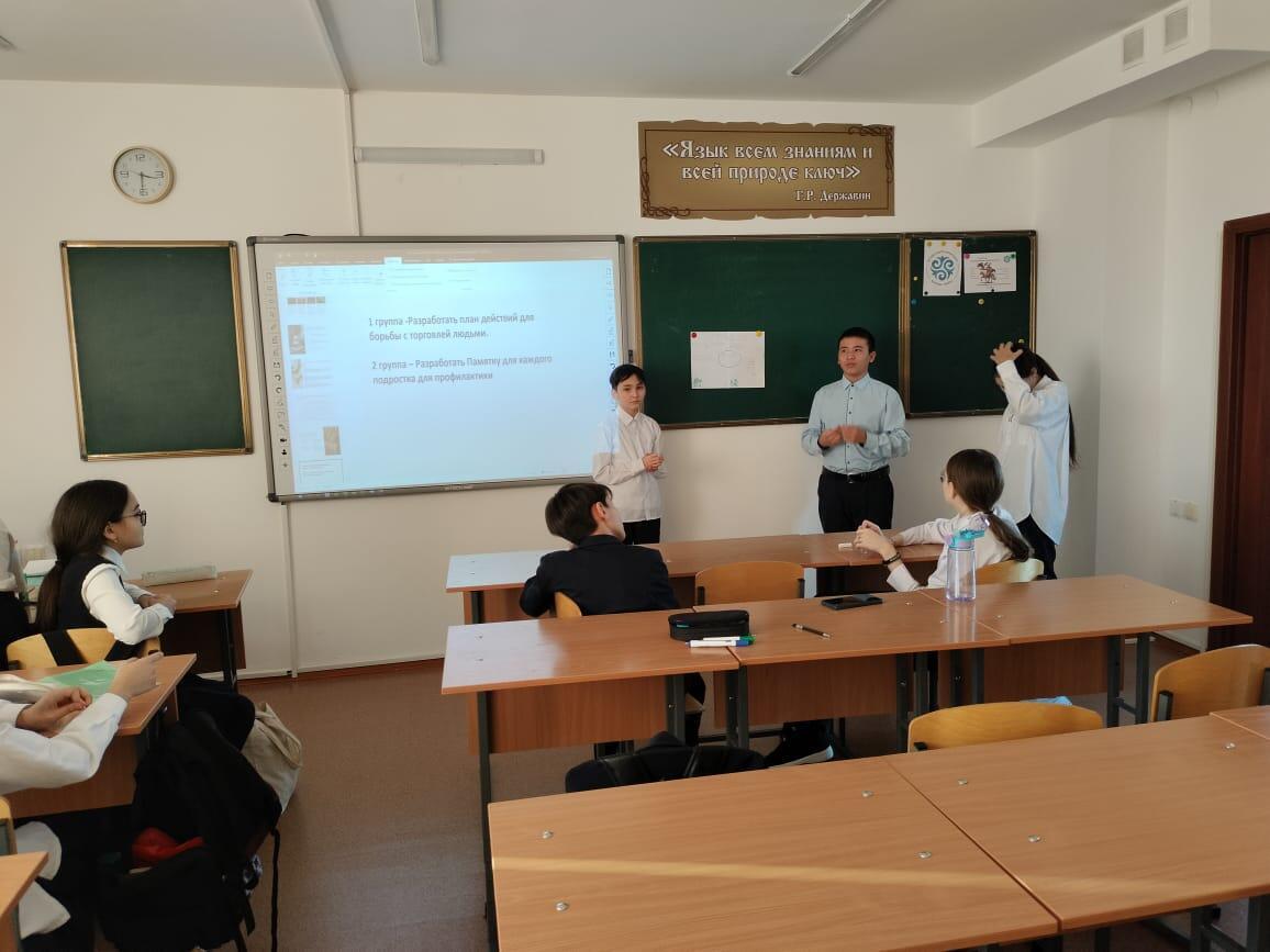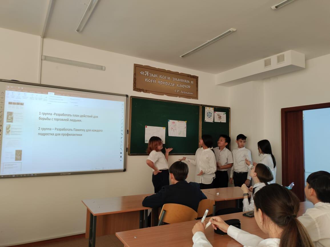 2024 жылғы 28 қарашада сынып сағаты аясында 7 “В”сыныбында”сатуға арналған адамдар” тақырыбында іс-шара өтті. Адамның бостандығы мен қол сұғылмаушылық құқығы. Осы іс-шара барысында сынып жетекшісі А.П. Баймағанбетова әлемдегі адам саудасы проблемасының ауқымын, сондай-ақ адам саудасының себептерін түсіндірді. Бұл тақырыпты бекіту үшін топ студенттері адам саудасына қарсы іс-қимыл жоспарын және адам саудагерлерінен аулақ болу үшін оқушыларға арналған жадынама жасады.