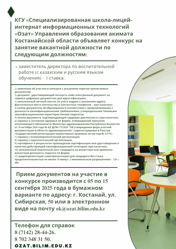 Вакансии от 12.08.2025 Вакансии от 11.08.2025 Вакансии от 19.08.2024 Вакансии от 21.08.2024 По итогам заседания Комиссии на присвоение (подтверждение) квалификационной категории педагогов Решение заседания конкурсной комиссии от 17.09.2024г. Итоги заседания комиссии по конкурсу по отбору кандидатов на занятие вакантной должности воспитателя, проходившему с 16.09.2024года по 25.09.2024года включительно. Подать документы и просмотреть все вакансии можете на сайте Национальной образовательной базы данных ЛИЧНЫЙ ЛИСТОК ПО УЧЕТУ КАДРОВ СКАЧАТЬ